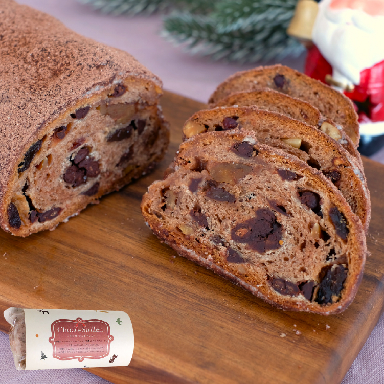 国産小麦100%で卵、酒、シナモンを使わず腕利きのパン職人がつくりました。日が経つにつれてフルーツ、砂糖、バターが生地に馴染んで深い味わいが楽しめます。天然酵母、有機ナッツ、有機ドライフルーツ使用、チョコは有機クーベルチュールチョコ(フェアトレード認証)使用。