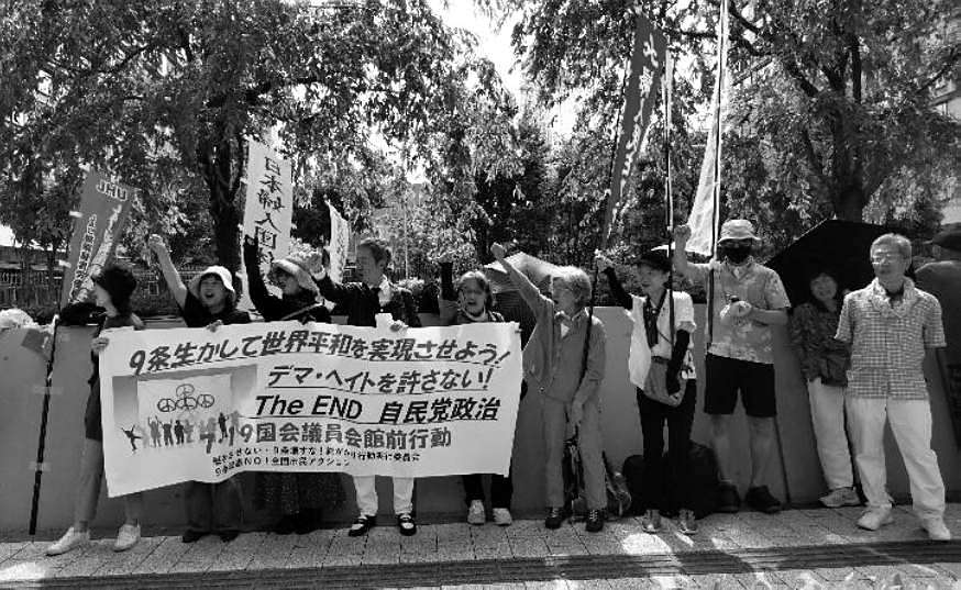総がかり行動実行委員会は7月19日、「9条生かして世界平和を実現させよう!デマ・ヘイトを許さない! ジ・エンド自民党政治・国会議員会館前行動」を行い、600人が参加しました。