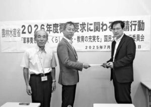 「軍事費削って、くらしと福祉・教育の充実を―国民大運動実行委員会」は7月30日、農水省に対して「需要に応じた生産」を改め、増産できるよう“直接支払い”制度の実施など5項目の要請を行いました。また、トランプ関税反対署名7万2340人分を提出しました。