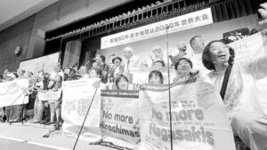 世界大会宣言では、核兵器使用の危機に直面し、国連憲章を踏みにじる武力行使や大軍拡を進める国が、公然と核戦力への依存を表明していることは重大であり、「核抑止」論は、核攻撃による壊滅的な結果、ヒロシマ・ナガサキの再現を前提とした政策であり、絶対に許されないと指摘しました。