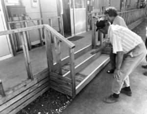 仮設住宅は、川からも近いため、今回の大雨でもかさ上げしている階段上部ギリギリまで水が上がってきたと言います。