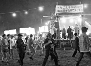 北海道の矢臼別演習場への農地売却を拒否した開拓農家(杉野芳夫さん、川瀬氾二さん)を励ますことで始まった矢臼別平和盆踊りに支援者が8月9日に集い、農民に土地を返せと今年も盛大に行われました。
