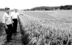 まさしく水不足による生育状況の悪化がわかるものでした。赤茶けた稲と不稔と思える青くまっすぐな穂と丈の短さは、暑さと水不足に耐えてきた姿でした。