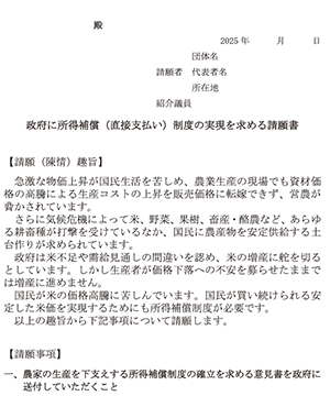 各自治体の12月、3月議会にむけて「所得補償(直接支払い)制度を求める意見書(陳情書)」運動を広げましょう。別掲のひな形を活用してください。農民連のホームページからダウンロードできます。