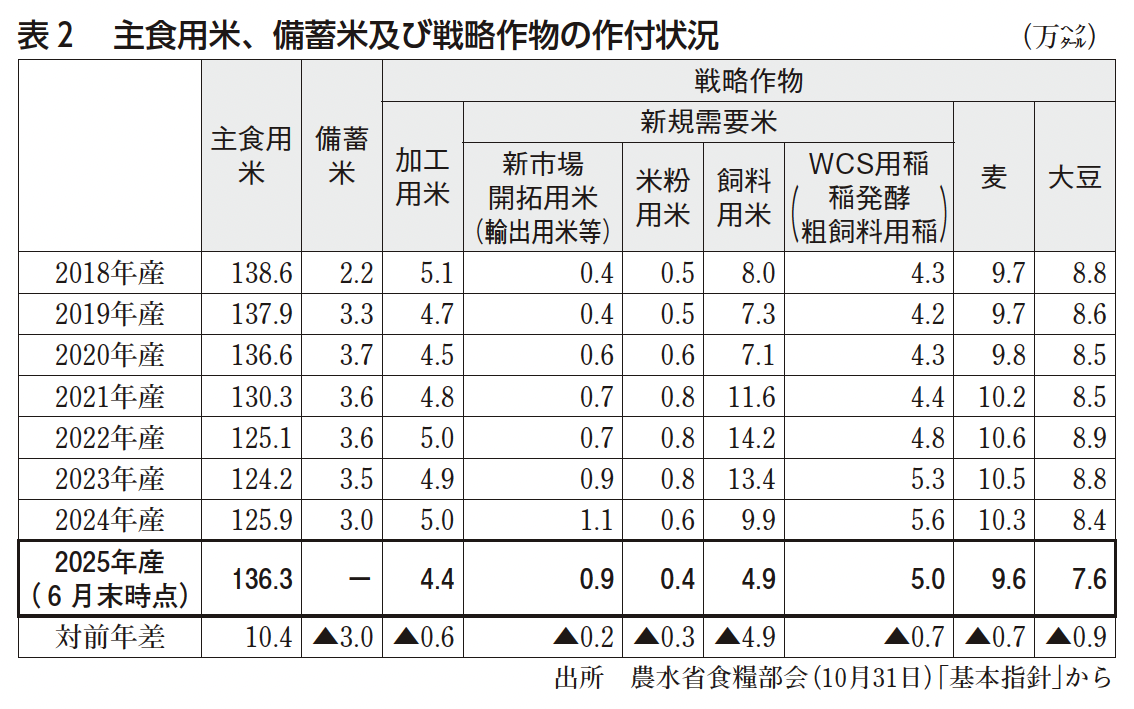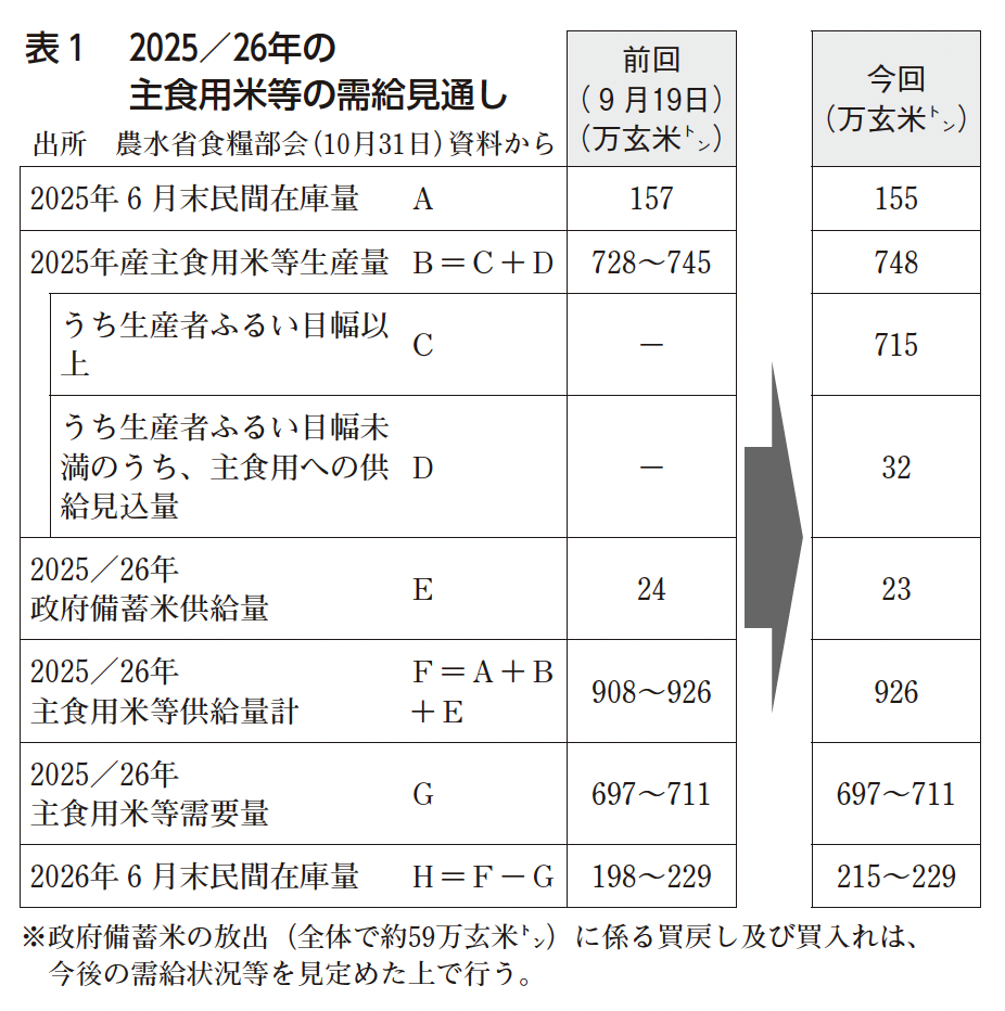 9月の指針からの「需要見通し」の変更点は、2025年産主食用米生産量が、廃止になった「作況指数」に代わり使用された「作況単収指数」に基づき「728~745万トン」から「748万トン」に増え、「908~926万トン」とされていた供給量の合計が「926万トン」に整理され、需要量「697~711万トン」は変更がなく、26年6月末在庫が「215~229万トン」に見直されました。(表1)