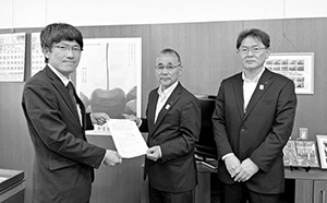 東根市農協で東根市農協の松浦洋二組合長(中央)から賛同書を受け取る山形県農協労の野尻丈道中央執行委員長(左)。右は加藤靖専務