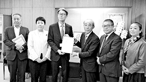 宮浦官房長(左から3人目)に要請書を手渡す長谷川会長(その右)ら