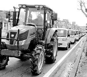 トラクターと軽トラ17台、荒天の中、80人がパレード