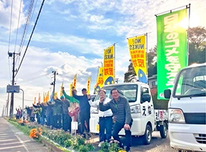 のぼり旗やプラカードで「食料自給率向上を政府の法的義務に」「インボイス制度廃止・消費税は5%に減税」「ALPS処理水海洋放出反対」などのスローガンを掲げ、軽トラや宣伝カーなど10数台が本宮市、大玉村、二本松市をパレードしました。