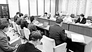 森井俊弘県連会長(こちら向き右から2人目)を先頭に内子町農民組合、たらの会(女性部)から代表が参加した農民連の要請。県議会議事堂で