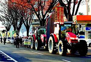 県庁周辺のデモは、トラクター2台、軽トラ6台とともに行進しました。シュプレヒコールに応えるように、ビルの窓やお店から飛び出てきて手を振ってくれる方もいました。知り合いを誘ってトラクターで駆けつけてくれた方は、「(すぐには決断できなかったけど)参加できてよかった。運動が大事。声をかけてもらってよかった」と話していました。