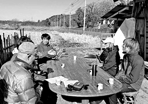 千葉県農民連の小倉毅副会長は、田んぼの管理を進めようと思っていた矢先の総選挙となり、「居ても立っても居られない!」と、急きょ地域の若手農家らに声をかけ、青空のもと「つどい」を開き、7人が参加しました。