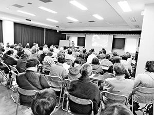 1月24日、福岡県八女(やめ)市の八女社会福祉会館で、農民連食品分析センターの八田純人所長の講演会が行われました。会場収容人数いっぱいで「身動きができない!」といううれしい悲鳴があがるほどでした。