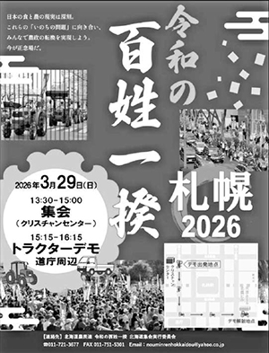 3月29日には、全国の百姓一揆に呼応して、北海道でも開催します。当日は札幌と釧路の2カ所で行います。