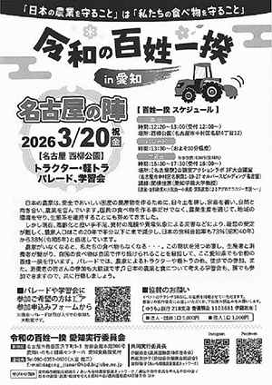 愛知県では、3月20日に「名古屋の陣」として名古屋市内をトラクターと軽トラでパレード。その後、愛知学院大学の関根佳恵教授による学習会「農業・食料政策の大転換―小規模・家族農業によるアグロエコロジー支援へ―」を開催します。