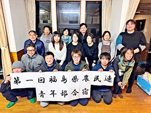 3月4日、福島県農民連青年部は、合宿形式で総会・バーベキュー交流会を須賀川市で開催しました。県内各地から18人が集まりました(写真)。焼肉、カレー、豚汁などでおなかいっぱいに。